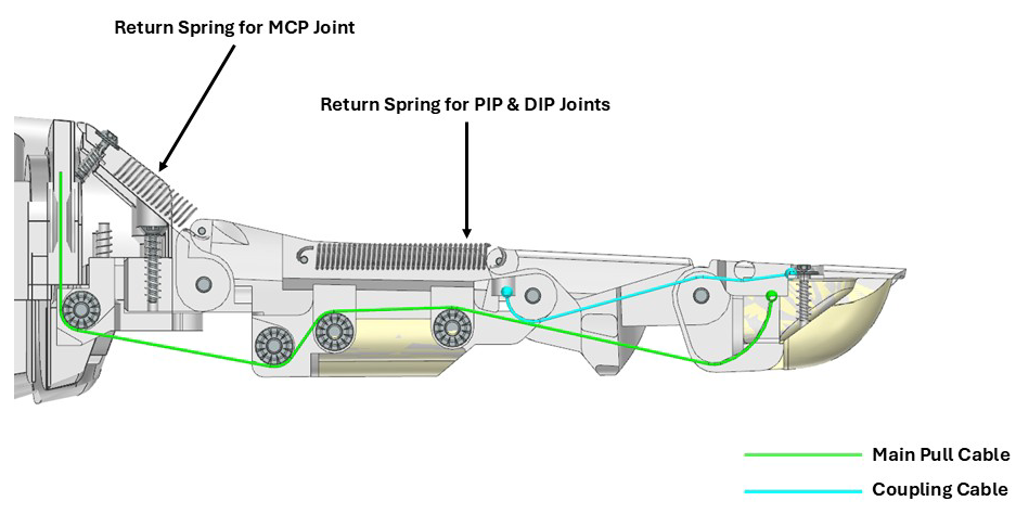 每根手指需要一条独立的腱线,从指尖穿过所有关节到达手掌的舵机。