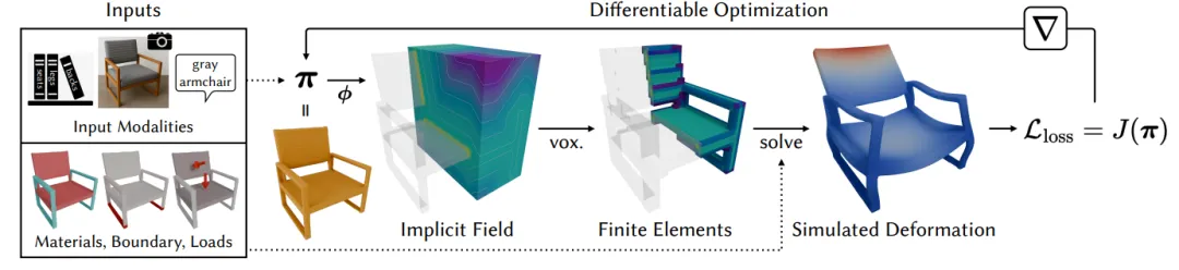 潜在参数→解码成隐式场(描述三维形状的连续数学函数)→转成体素网格→有限元分析→算出物理损耗→反传梯度→更新潜在参数。一个完整的闭环,全程可微分,意味着梯度能顺着链路一路传回去。
