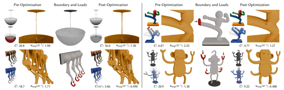 左边是AI生成的原始模型,中间用户指定受力点和材料,右边是优化后的结果。