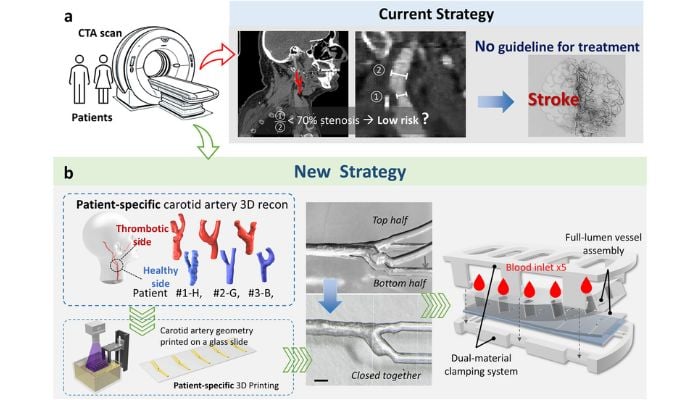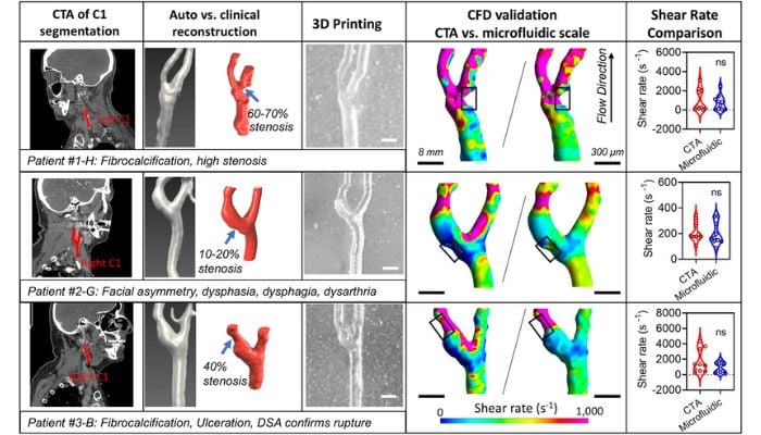 该技术通过采用中风患者的CT扫描数据,将实际尺寸5-7毫米的颈动脉微缩至200-300微米,在玻璃基板上精确打印出包含健康与病变区域的血管复制品。