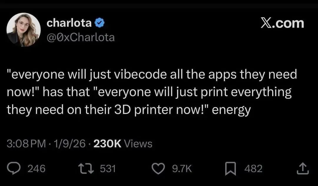 现在把"3D打印"替换成"氛围编程"这个热词,我们会发现这个剧本一字不差。