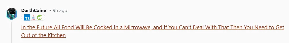 "在未来,所有食物都将用微波炉烹饪。如果你接受不了,就滚出厨房。"