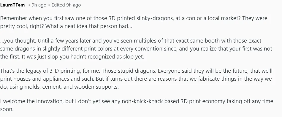 值得注意的是,帖子里真正在用3D打印机工作的人,没有一个人说"3D打印什么都能做",但他们也没有一个人说"3D打印没用"。