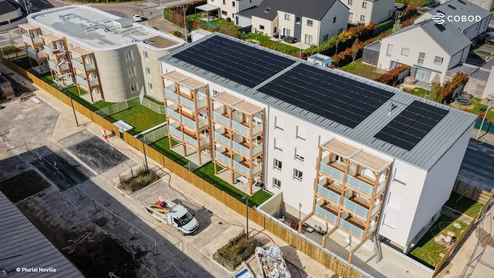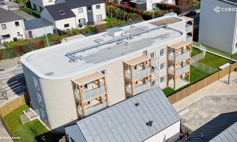 除了核心的增材制造结构,该项目还集成了珍珠岩保温系统、木质阳台、光伏面板及混合能源系统等特色配置,使其能效大幅提升,实现了约60%的能源自给率,并已达到法国严格的RE2020 2025能效标准。