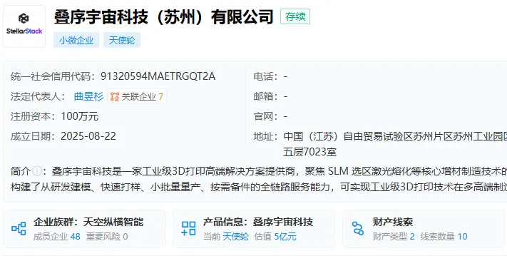企查查数据显示,叠序宇宙科技(苏州)有限公司成立于2025年8月22日,注册资本100万元,归属天空纵横智能企业族群。