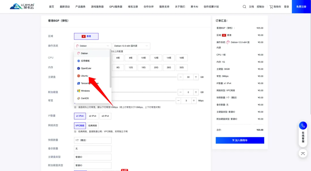 我们需要将系统改为Ubuntu系统,CPU改为2核,内存改为2G的。
