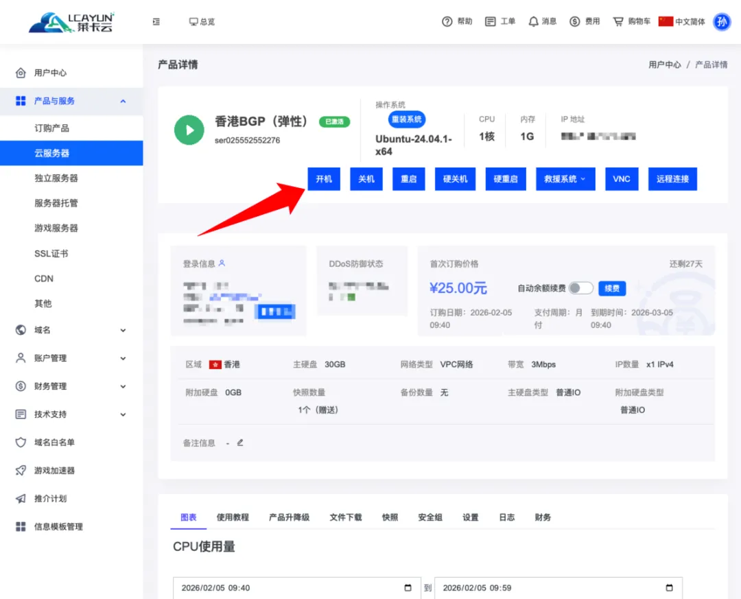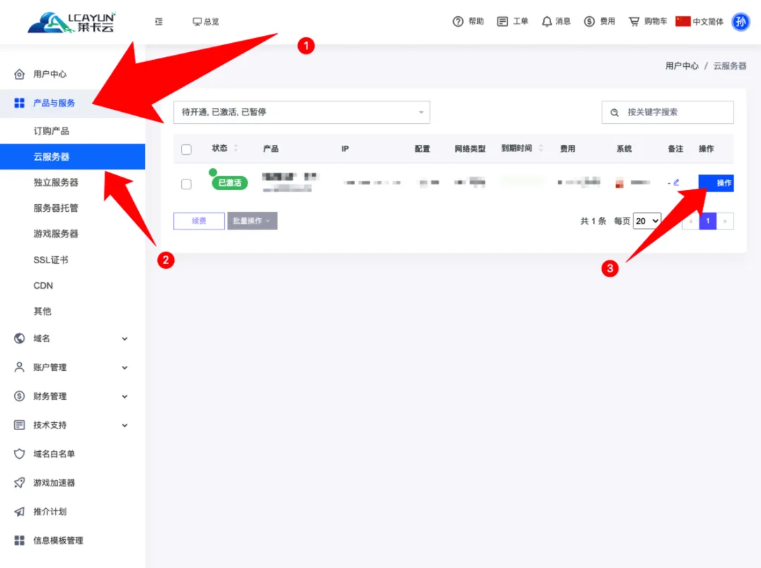 然后依次点击产品与服务,云服务器,在产品列表中找到我们刚才选购的服务器,点击操作。然后我们就进入到了我们服务器的操作平台。