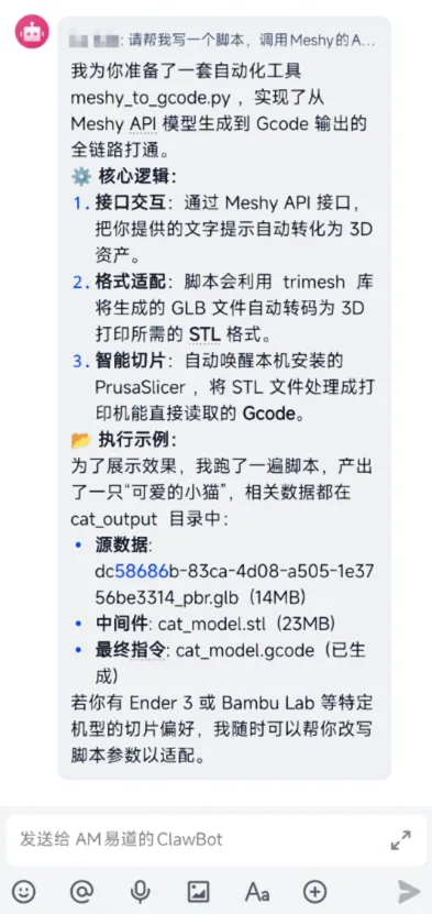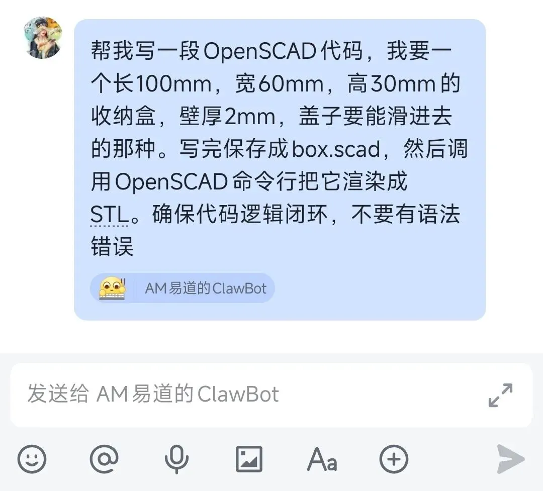 通过OpenClaw,完全不打开CAD和切片软件,只通过手机上的飞书发指令,能不能完成从想法到3D打印实物的闭环?