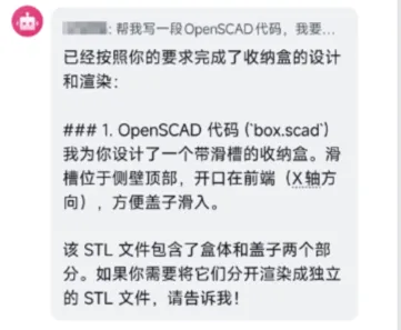 一边是那个传统的老工匠:这也太懒了吧?连写个OpenSCAD代码、改个配置文件都要找AI,以后是不是连调平都要AI帮你拧螺丝了?