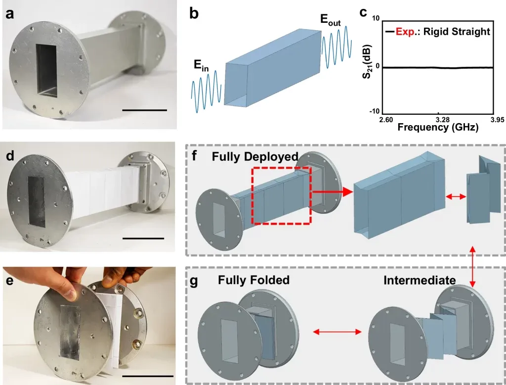 伊利诺伊大学厄巴纳-香槟分校与宾夕法尼亚州立大学的研究团队近期展示了一种受折纸启发的可折叠电磁波导结构,该结构可实现折叠、展开、弯曲和扭转,同时保持与刚性矩形波导相当的微波传输性能。