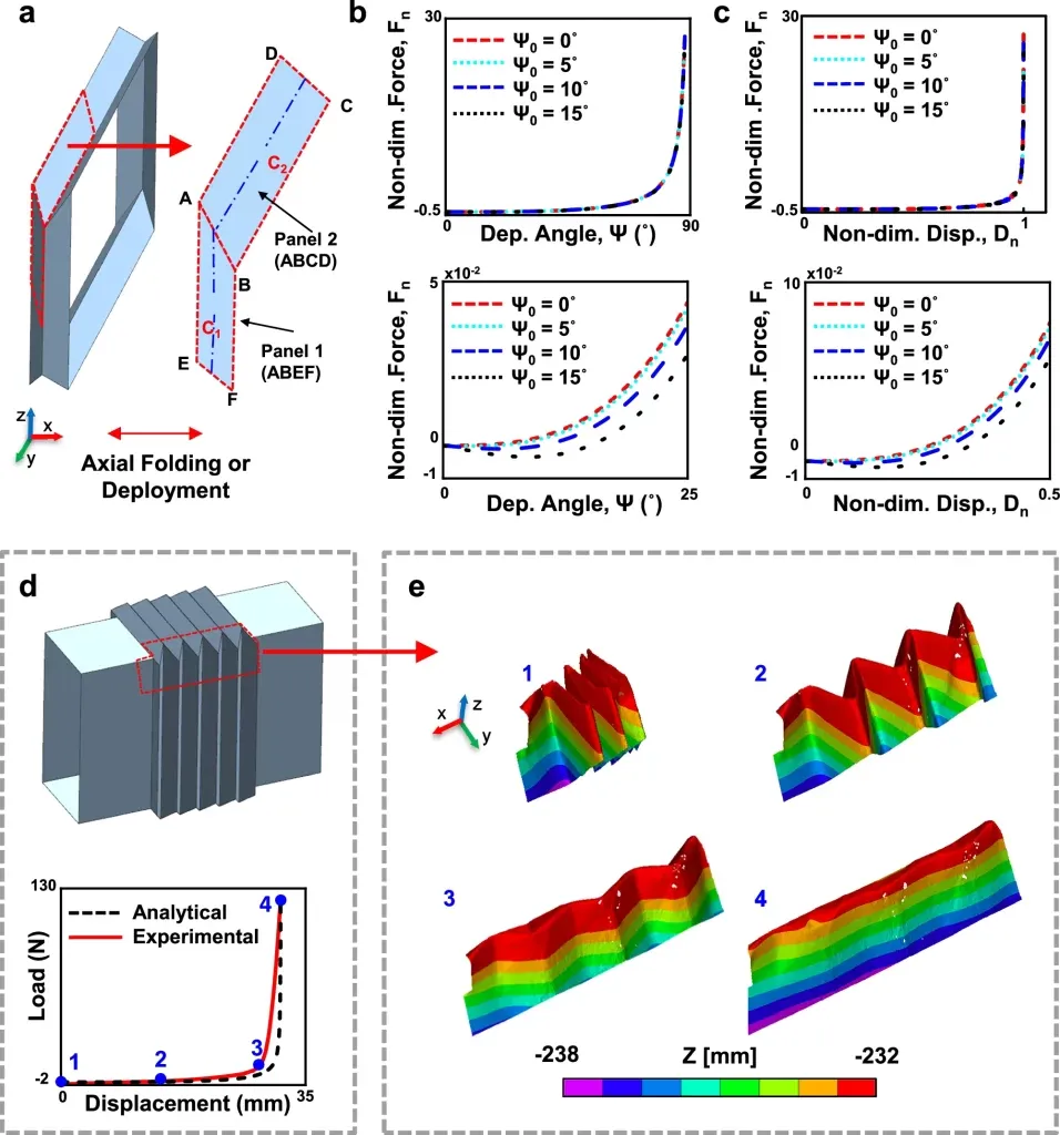 研究人员还开发了可扭转的折纸波导,能够在轴向展开的同时实现90度极化旋转。运动学模型支持针对特定旋转角度进行长度设计,仿真显示其传播性能稳定。