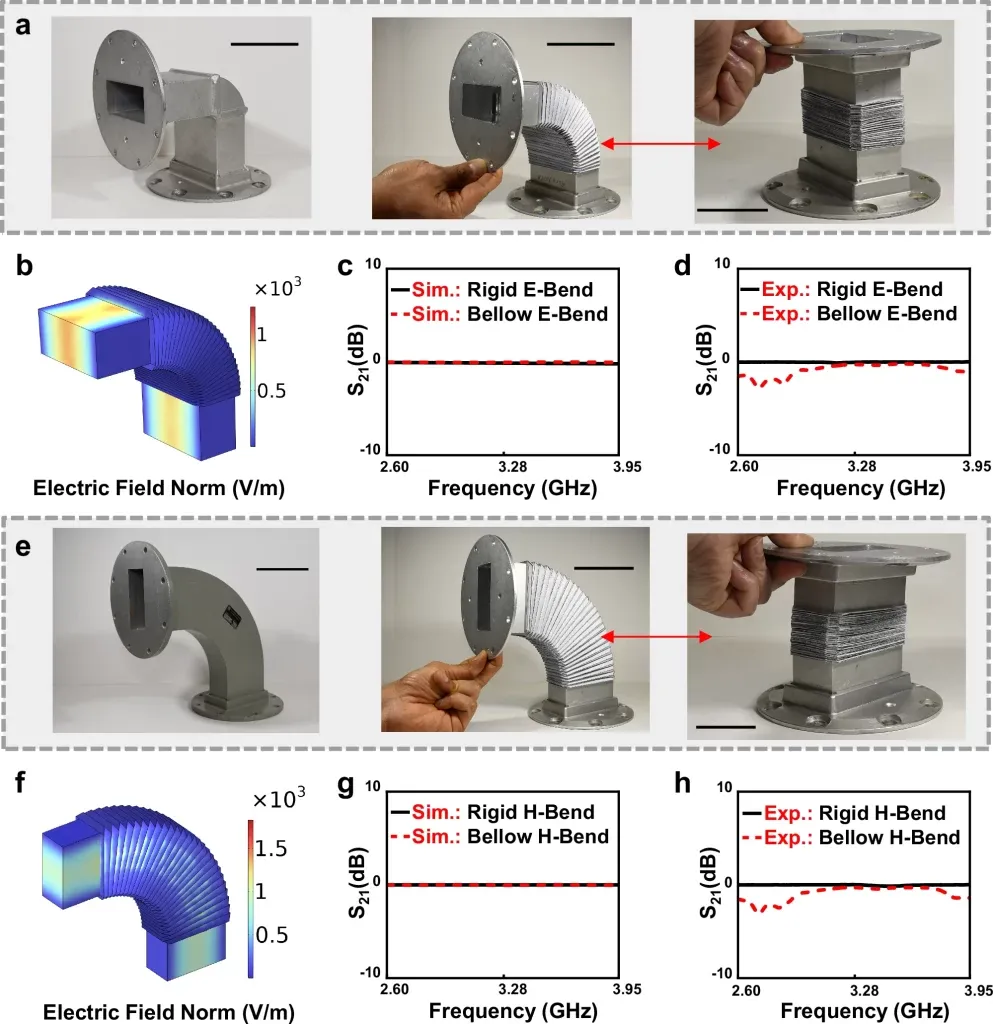 另一种波纹管波导设计支持连续长度变化和可控弯曲,可重构为直通、E弯和H弯等常用微波路由形态。压缩状态下长度减少59%,仿真与实测损耗均接近实用标准。