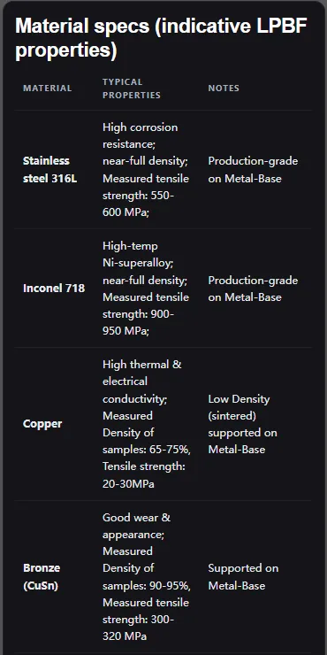 Metal-Base声称316L和Inconel可以做到near-fully dense,但目前没有第三方检测数据;