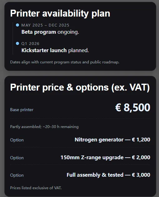 价格方面,基础版8500欧(半组装,需用户自己完成约20-30小时的装配),氮气发生器选配1200欧元,150mm Z轴升级2000欧元,全组装测试版本额外加3000欧元。