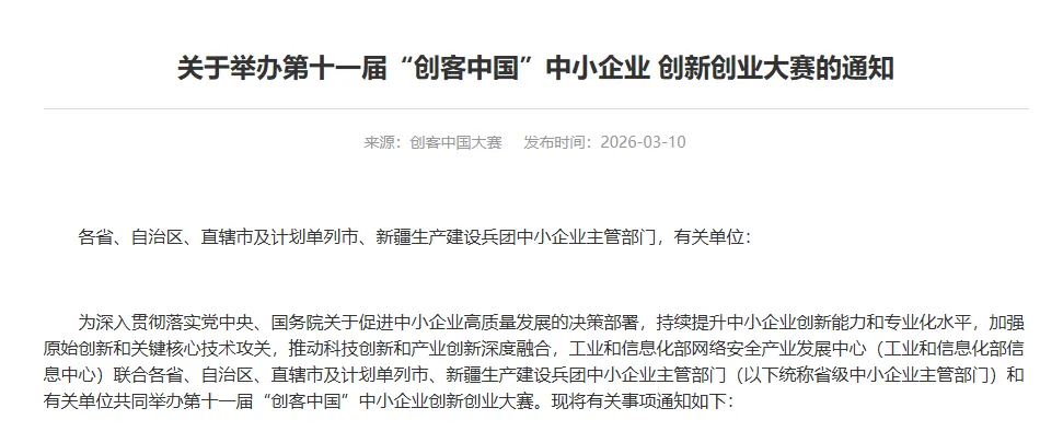 "创客中国"是工业和信息化部主导的国家级创新创业赛事,连续举办多届,覆盖制造业、信息技术、新材料等多个领域,是工信系统内影响力最大的创业赛事平台之一。